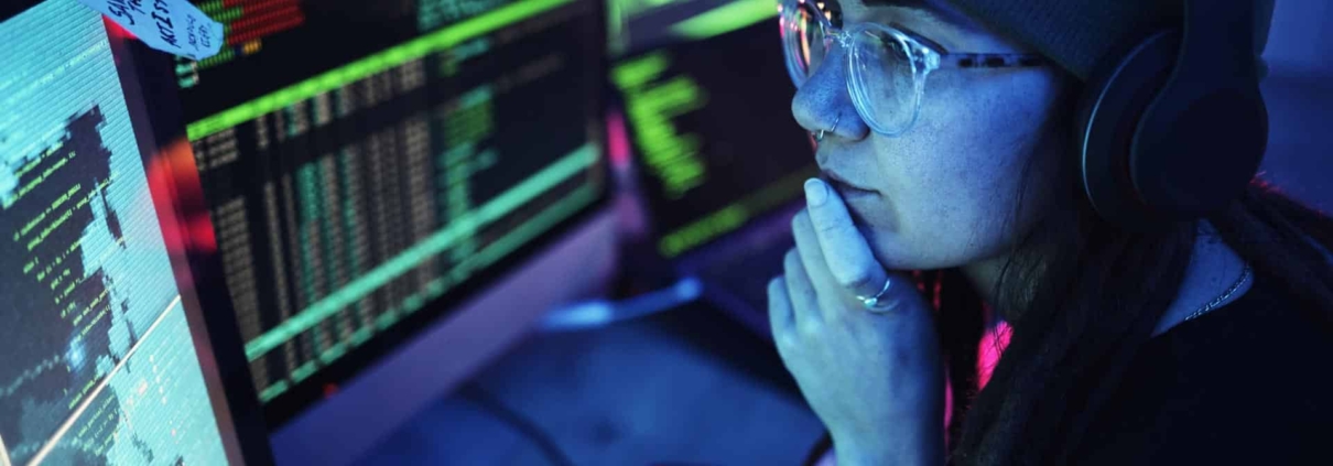 Frau mit langen rötlichen Haaren sitzt vor mehreren Bildschirmen, auf denen Quellcode und Entwicklungsumgebungen abgebildet sind.